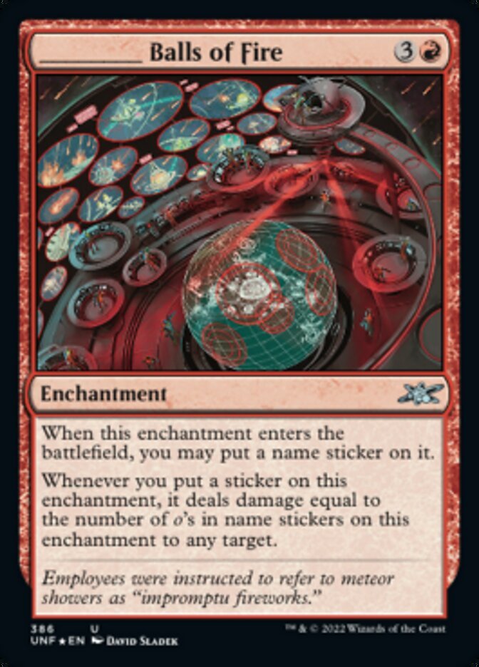 When this enchantment enters the battlefield, you may put a name sticker on it. Whenever you put a sticker on this enchantment, it deals damage equal to the number of o's in name stickers on this enchantment to any target.