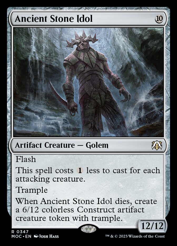 Flash This spell costs {1} less to cast for each attacking creature. Trample When Ancient Stone Idol dies, create a 6/12 colorless Construct artifact creature token with trample.
