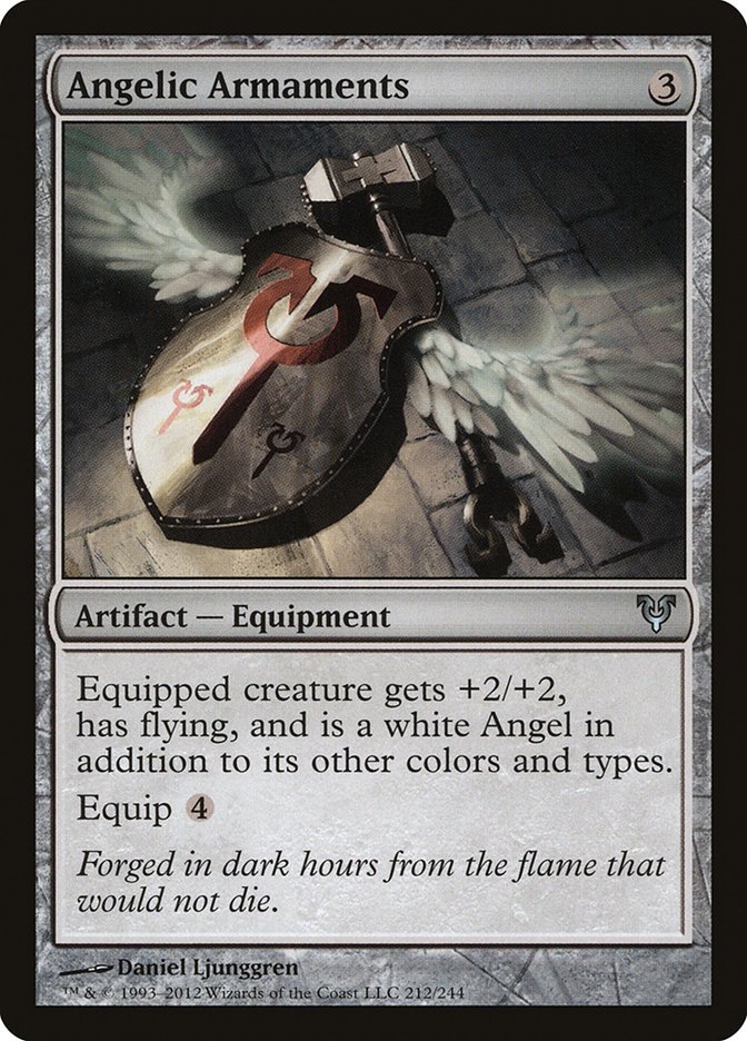 Equipped creature gets +2/+2, has flying, and is a white Angel in addition to its other colors and types. Equip {4}