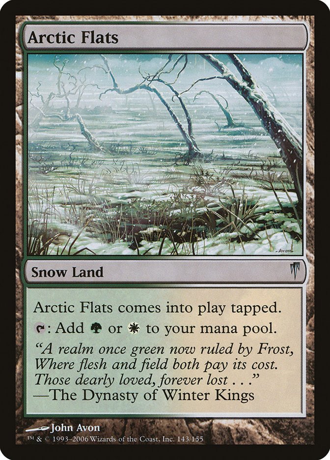 Arctic Flats enters the battlefield tapped. {T}: Add {G} or {W}.