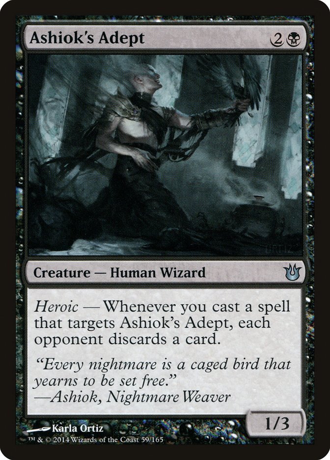 Heroic — Whenever you cast a spell that targets Ashiok's Adept, each opponent discards a card.