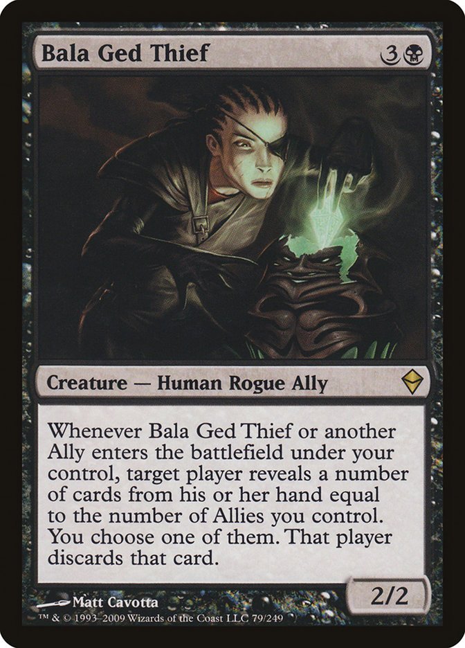 Whenever Bala Ged Thief or another Ally enters the battlefield under your control, target player reveals a number of cards from their hand equal to the number of Allies you control. You choose one of them. That player discards that card.