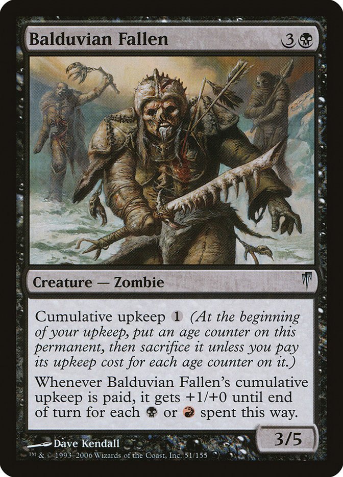 Cumulative upkeep {1} (At the beginning of your upkeep, put an age counter on this permanent, then sacrifice it unless you pay its upkeep cost for each age counter on it.) Whenever Balduvian Fallen's cumulative upkeep is paid, it gets +1/+0 until end of turn for each {B} or {R} spent this way.