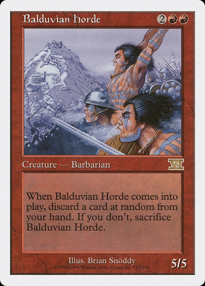 When Balduvian Horde enters the battlefield, sacrifice it unless you discard a card at random.