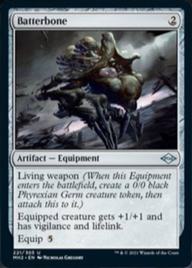 Living weapon (When this Equipment enters the battlefield, create a 0/0 black Phyrexian Germ creature token, then attach this to it.) Equipped creature gets +1/+1 and has vigilance and lifelink. Equip {5}