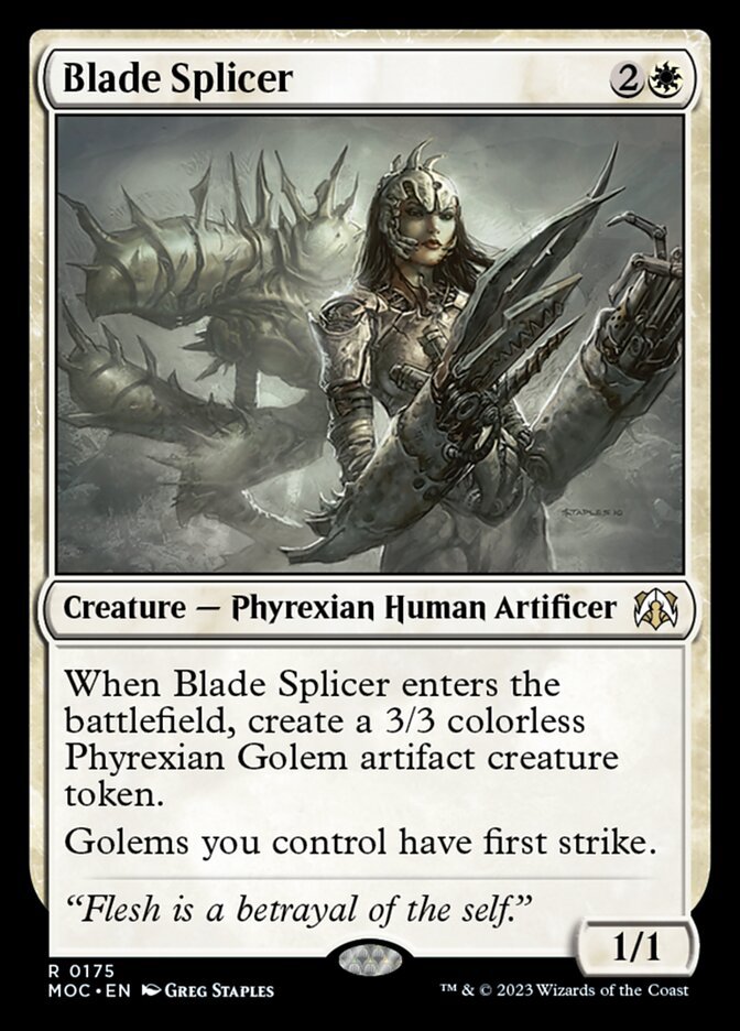 When Blade Splicer enters the battlefield, create a 3/3 colorless Phyrexian Golem artifact creature token. Golems you control have first strike.