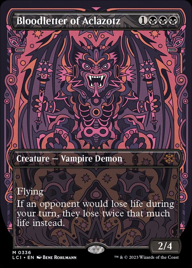 Flying If an opponent would lose life during your turn, they lose twice that much life instead. (Damage causes loss of life.)