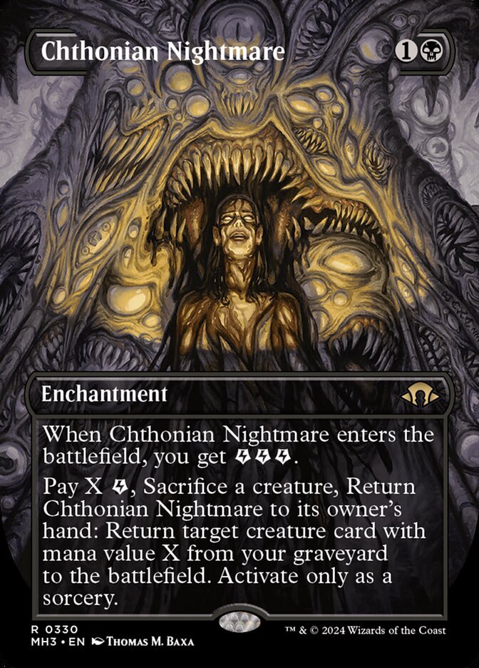 When Chthonian Nightmare enters the battlefield, you get {E}{E}{E} (three energy counters). Pay X {E}, Sacrifice a creature, Return Chthonian Nightmare to its owner's hand: Return target creature card with mana value X from your graveyard to the battlefield. Activate only as a sorcery.