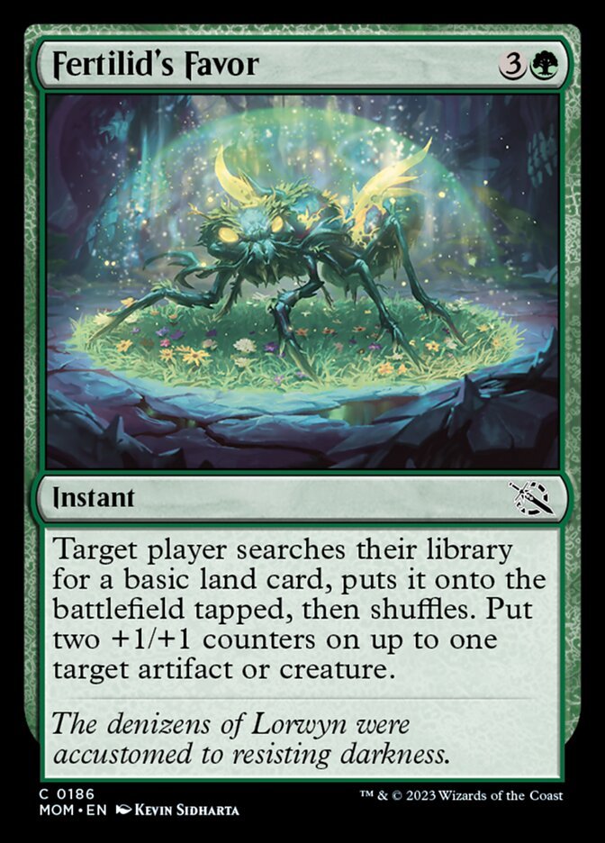 Target player searches their library for a basic land card, puts it onto the battlefield tapped, then shuffles. Put two +1/+1 counters on up to one target artifact or creature.