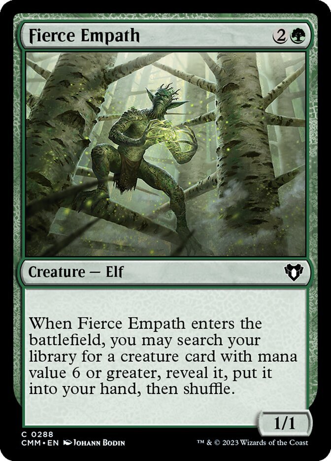 When Fierce Empath enters the battlefield, you may search your library for a creature card with mana value 6 or greater, reveal it, put it into your hand, then shuffle.