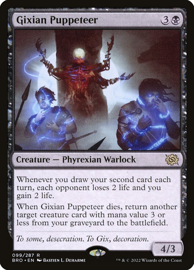 Whenever you draw your second card each turn, each opponent loses 2 life and you gain 2 life. When Gixian Puppeteer dies, return another target creature card with mana value 3 or less from your graveyard to the battlefield.