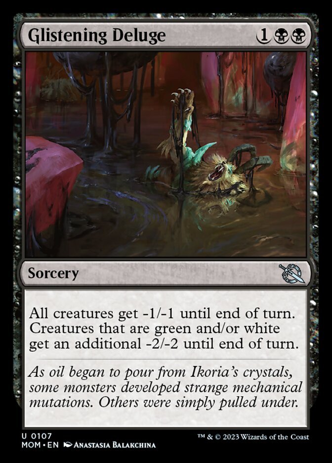 All creatures get -1/-1 until end of turn. Creatures that are green and/or white get an additional -2/-2 until end of turn.