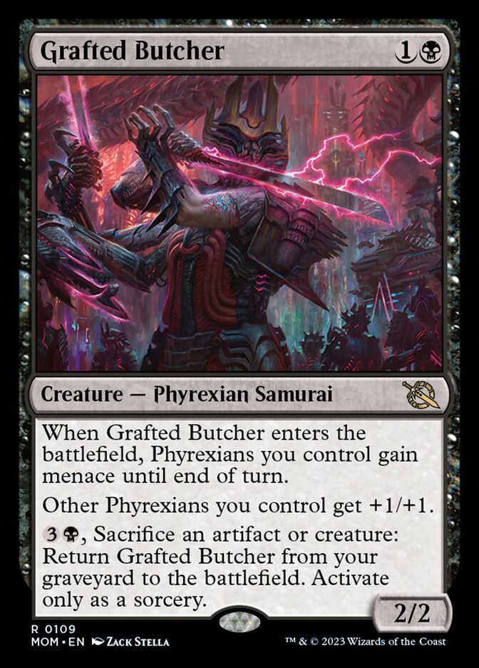 When Grafted Butcher enters the battlefield, Phyrexians you control gain menace until end of turn. Other Phyrexians you control get +1/+1. {3}{B}, Sacrifice an artifact or creature: Return Grafted Butcher from your graveyard to the battlefield. Activate only as a sorcery.