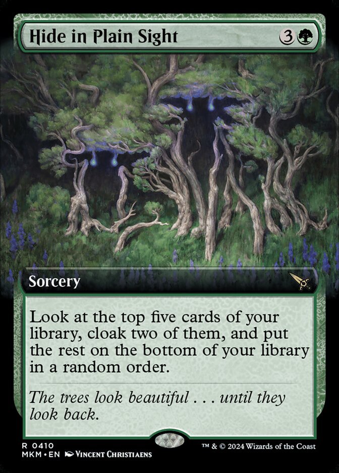Look at the top five cards of your library, cloak two of them, and put the rest on the bottom of your library in a random order. (To cloak a card, put it onto the battlefield face down as a 2/2 creature with ward {2}. Turn it face up any time for its mana cost if it's a creature card.)