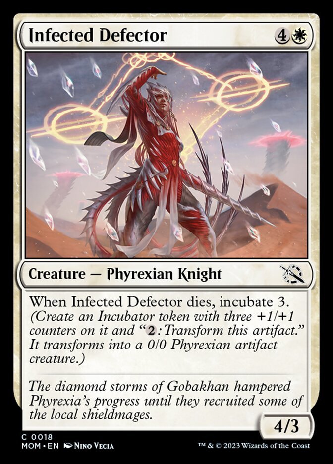 When Infected Defector dies, incubate 3. (Create an Incubator token with three +1/+1 counters on it and "{2}: Transform this artifact." It transforms into a 0/0 Phyrexian artifact creature.)