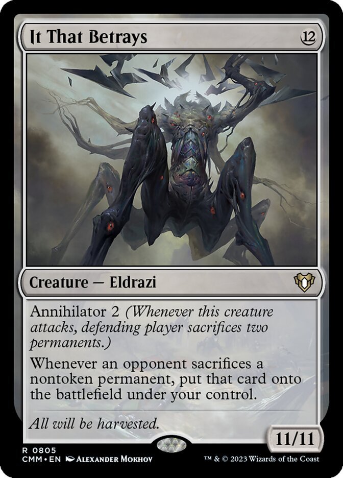 Annihilator 2 (Whenever this creature attacks, defending player sacrifices two permanents.) Whenever an opponent sacrifices a nontoken permanent, put that card onto the battlefield under your control.