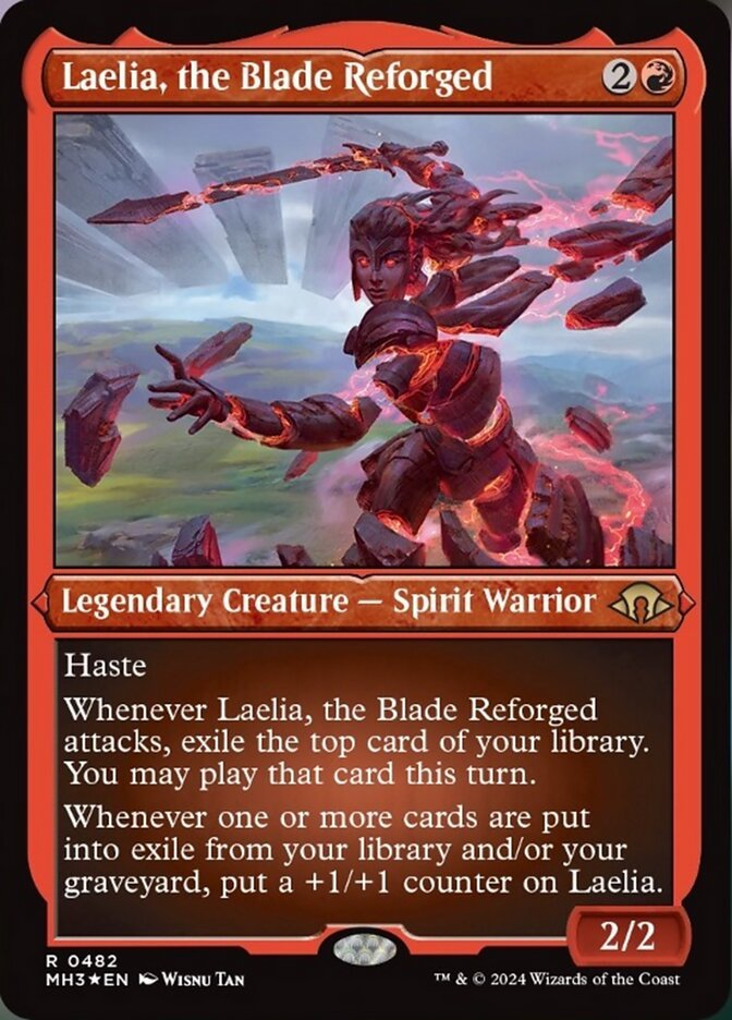 Haste Whenever Laelia, the Blade Reforged attacks, exile the top card of your library. You may play that card this turn. Whenever one or more cards are put into exile from your library and/or your graveyard, put a +1/+1 counter on Laelia.