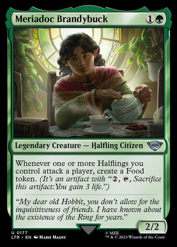 Whenever one or more Halflings you control attack a player, create a Food token. (It's an artifact with "{2}, {T}, Sacrifice this artifact: You gain 3 life.")