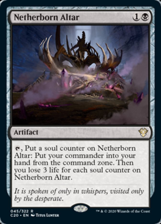 {T}, Put a soul counter on Netherborn Altar: Put your commander into your hand from the command zone. Then you lose 3 life for each soul counter on Netherborn Altar.