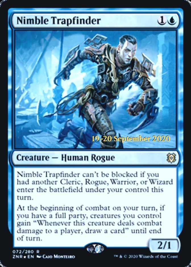 Nimble Trapfinder can't be blocked if you had another Cleric, Rogue, Warrior, or Wizard enter the battlefield under your control this turn. At the beginning of combat on your turn, if you have a full party, creatures you control gain "Whenever this creature deals combat damage to a player, draw a card" until end of turn.