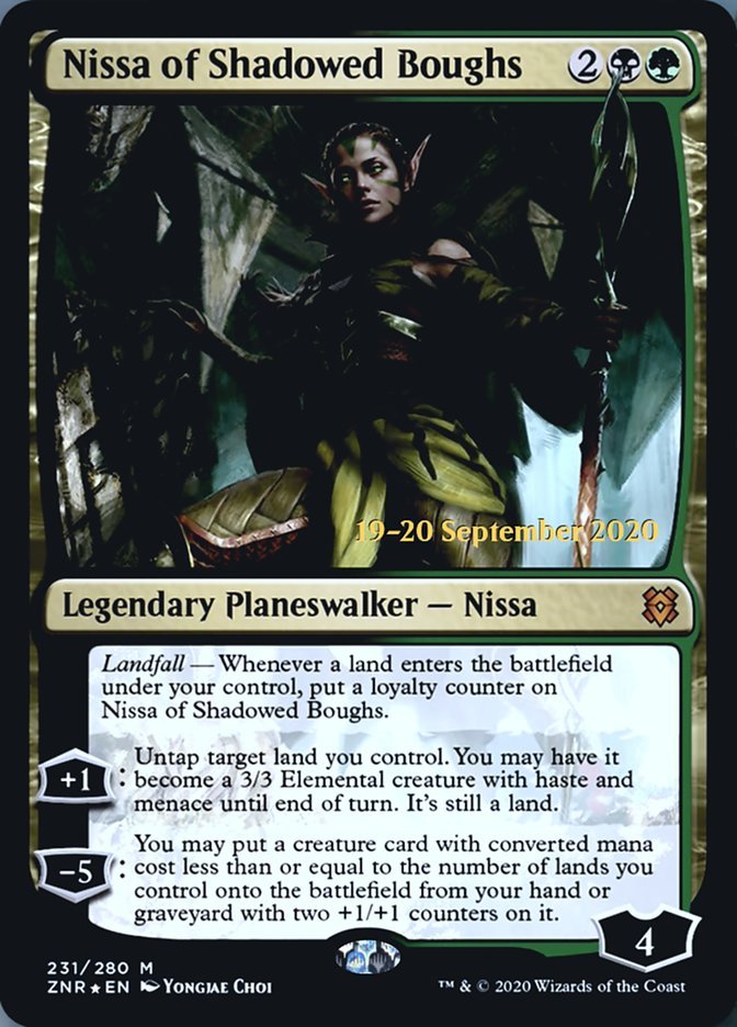 Landfall — Whenever a land enters the battlefield under your control, put a loyalty counter on Nissa of Shadowed Boughs. +1: Untap target land you control. You may have it become a 3/3 Elemental creature with haste and menace until end of turn. It's still a land. −5: You may put a creature card with converted mana cost less than or equal to the number of lands you control onto the battlefield from your hand or graveyard with two +1/+1 counters on it.