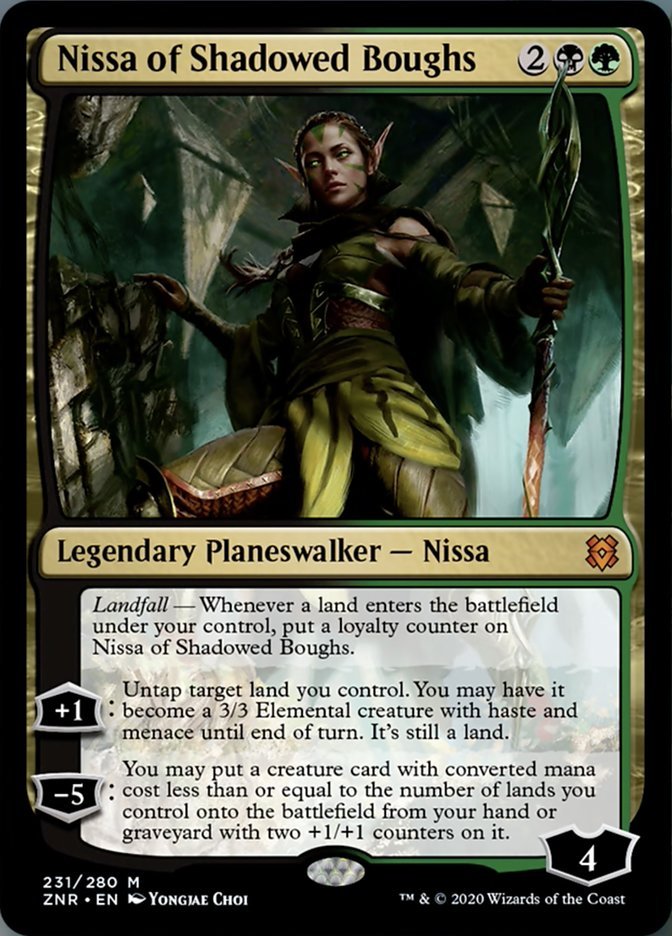 Landfall — Whenever a land enters the battlefield under your control, put a loyalty counter on Nissa of Shadowed Boughs. +1: Untap target land you control. You may have it become a 3/3 Elemental creature with haste and menace until end of turn. It's still a land. −5: You may put a creature card with converted mana cost less than or equal to the number of lands you control onto the battlefield from your hand or graveyard with two +1/+1 counters on it.