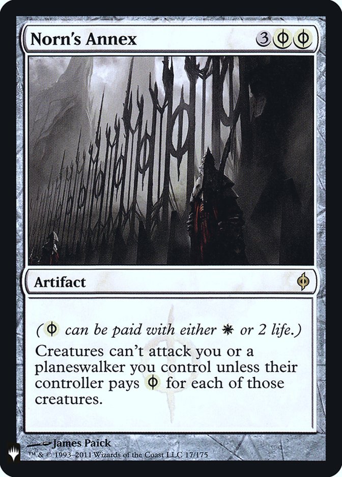 ({W/P} can be paid with either {W} or 2 life.) Creatures can't attack you or a planeswalker you control unless their controller pays {W/P} for each of those creatures.