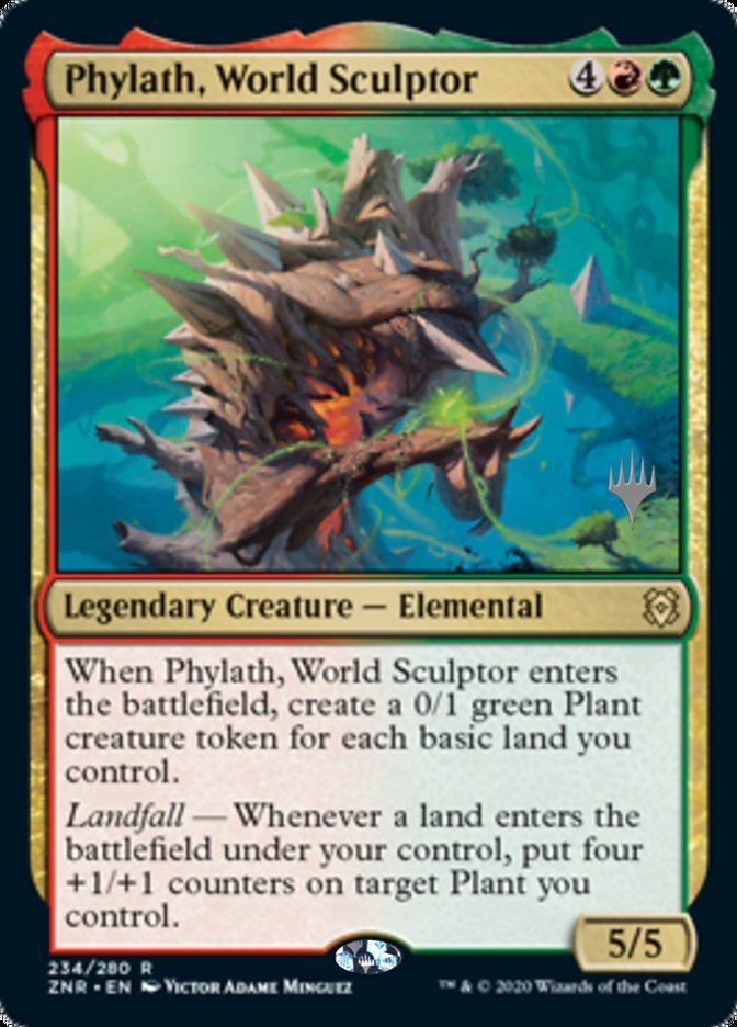 When Phylath, World Sculptor enters the battlefield, create a 0/1 green Plant creature token for each basic land you control. Landfall — Whenever a land enters the battlefield under your control, put four +1/+1 counters on target Plant you control.