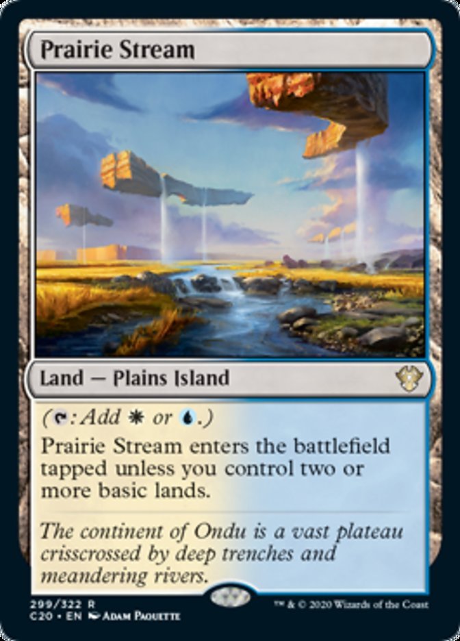({T}: Add {W} or {U}.) Prairie Stream enters the battlefield tapped unless you control two or more basic lands.