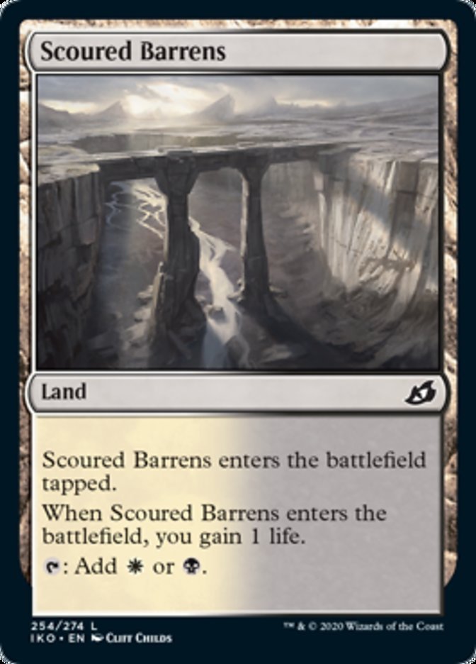 Scoured Barrens enters the battlefield tapped. When Scoured Barrens enters the battlefield, you gain 1 life. {T}: Add {W} or {B}.