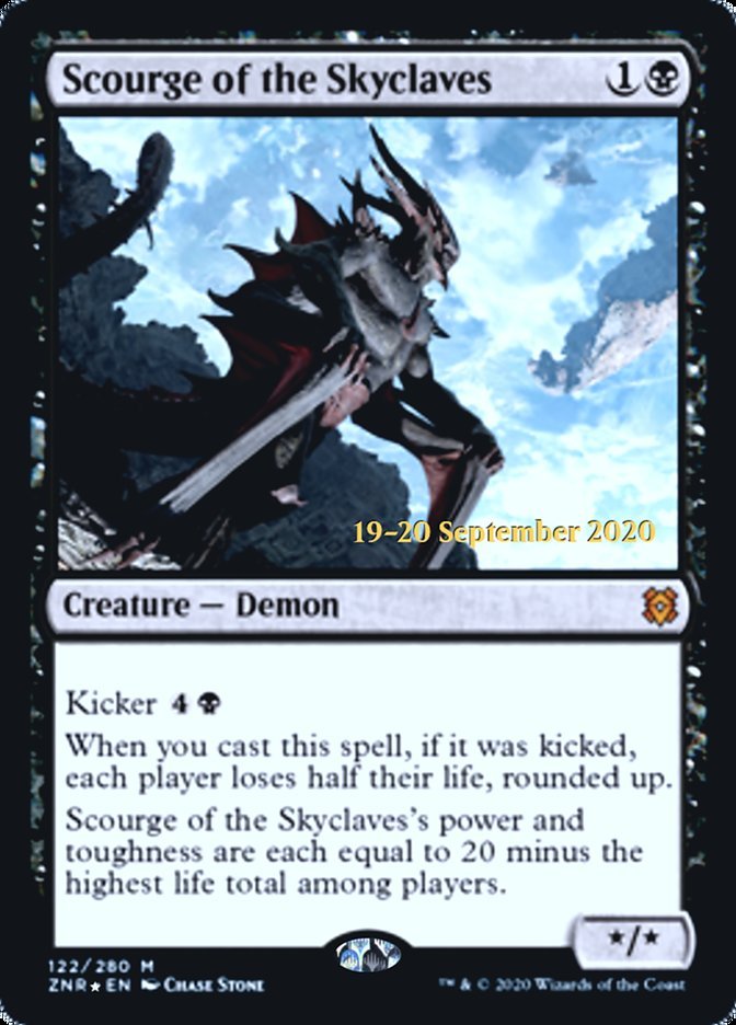 Kicker {4}{B} When you cast this spell, if it was kicked, each player loses half their life, rounded up. Scourge of the Skyclaves's power and toughness are each equal to 20 minus the highest life total among players.