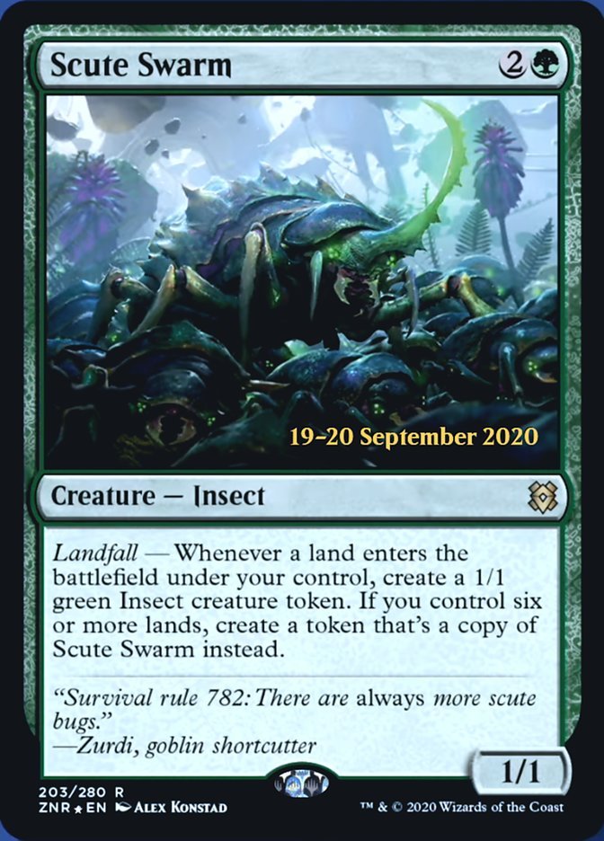 Landfall — Whenever a land enters the battlefield under your control, create a 1/1 green Insect creature token. If you control six or more lands, create a token that's a copy of Scute Swarm instead.