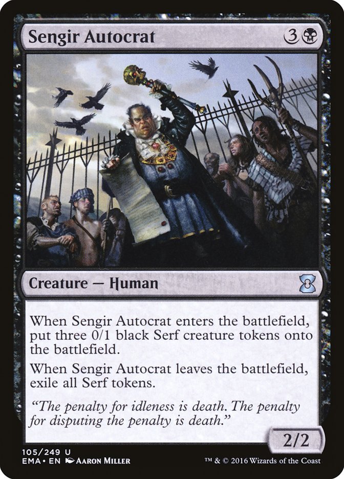 When Sengir Autocrat enters the battlefield, create three 0/1 black Serf creature tokens. When Sengir Autocrat leaves the battlefield, exile all Serf tokens.