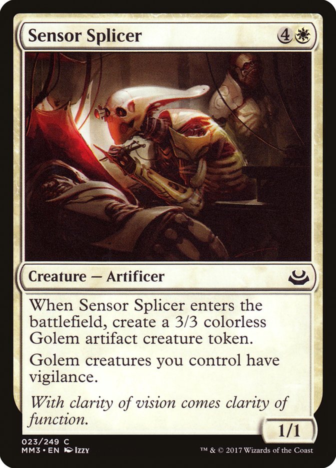 When Sensor Splicer enters the battlefield, create a 3/3 colorless Golem artifact creature token. Golem creatures you control have vigilance.