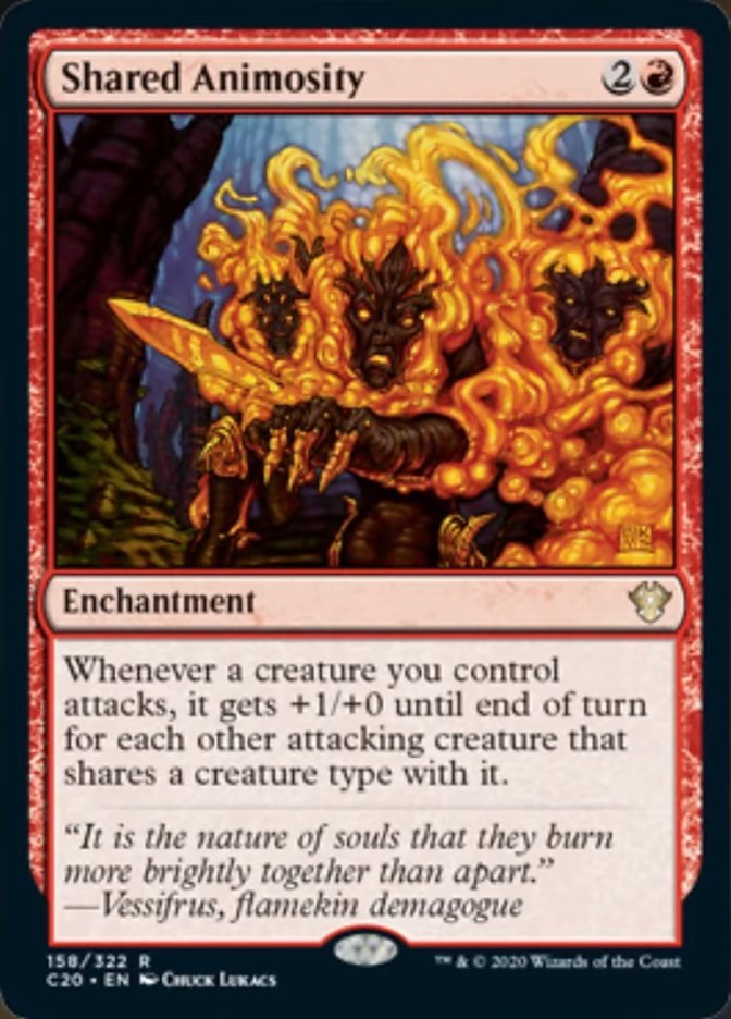 Whenever a creature you control attacks, it gets +1/+0 until end of turn for each other attacking creature that shares a creature type with it.