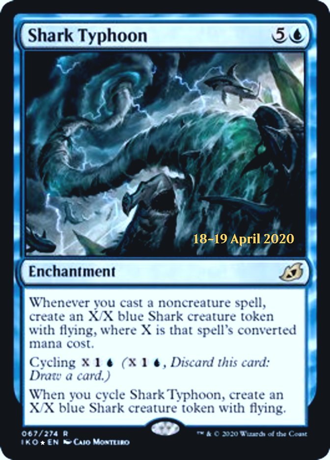 Whenever you cast a noncreature spell, create an X/X blue Shark creature token with flying, where X is that spell's converted mana cost. Cycling {X}{1}{U} ({X}{1}{U}, Discard this card: Draw a card.) When you cycle Shark Typhoon, create an X/X blue Shark creature token with flying.