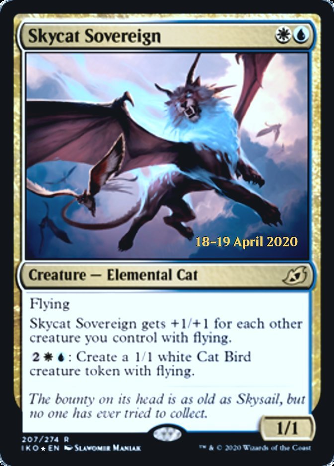 Flying Skycat Sovereign gets +1/+1 for each other creature you control with flying. {2}{W}{U}: Create a 1/1 white Cat Bird creature token with flying.