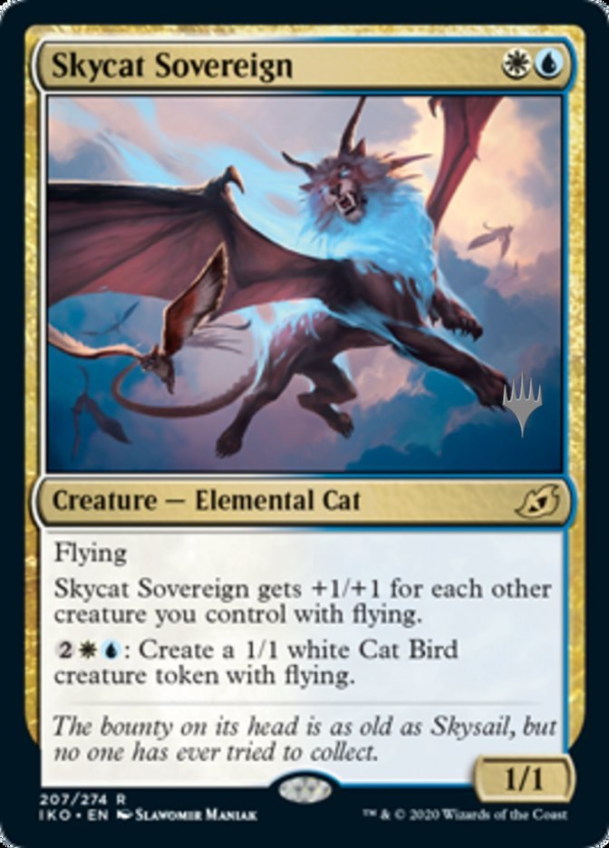 Flying Skycat Sovereign gets +1/+1 for each other creature you control with flying. {2}{W}{U}: Create a 1/1 white Cat Bird creature token with flying.
