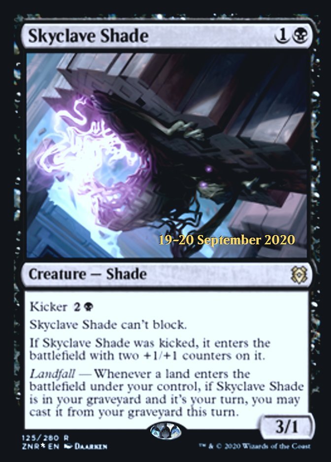 Kicker {2}{B} Skyclave Shade can't block. If Skyclave Shade was kicked, it enters the battlefield with two +1/+1 counters on it. Landfall — Whenever a land enters the battlefield under your control, if Skyclave Shade is in your graveyard and it's your turn, you may cast it from your graveyard this turn.