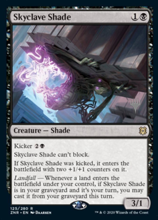 Kicker {2}{B} Skyclave Shade can't block. If Skyclave Shade was kicked, it enters the battlefield with two +1/+1 counters on it. Landfall — Whenever a land enters the battlefield under your control, if Skyclave Shade is in your graveyard and it's your turn, you may cast it from your graveyard this turn.