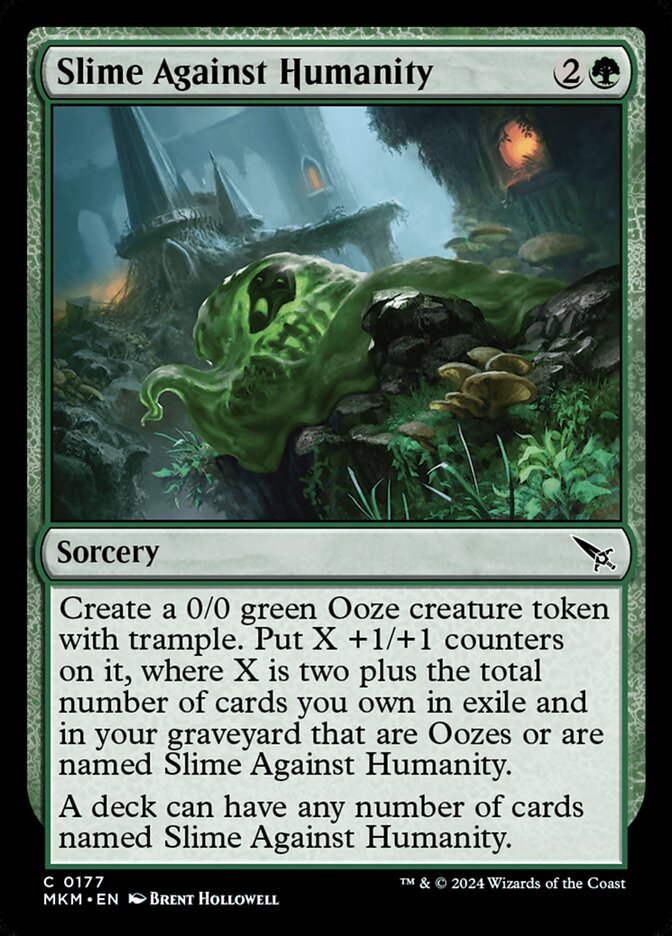 Create a 0/0 green Ooze creature token with trample. Put X +1/+1 counters on it, where X is two plus the total number of cards you own in exile and in your graveyard that are Oozes or are named Slime Against Humanity. A deck can have any number of cards named Slime Against Humanity.