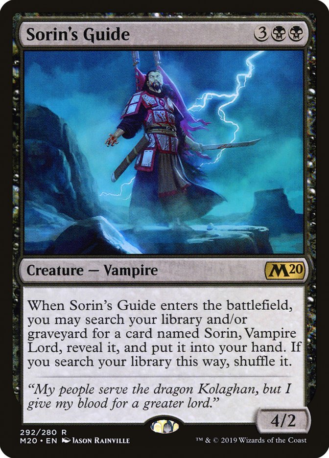 When Sorin's Guide enters the battlefield, you may search your library and/or graveyard for a card named Sorin, Vampire Lord, reveal it, and put it into your hand. If you search your library this way, shuffle it.