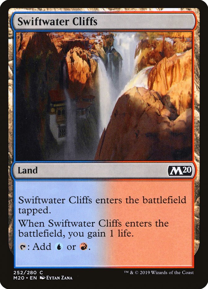 Swiftwater Cliffs enters the battlefield tapped. When Swiftwater Cliffs enters the battlefield, you gain 1 life. {T}: Add {U} or {R}.