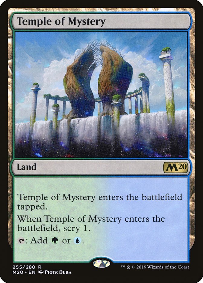 Temple of Mystery enters the battlefield tapped. When Temple of Mystery enters the battlefield, scry 1. {T}: Add {G} or {U}.
