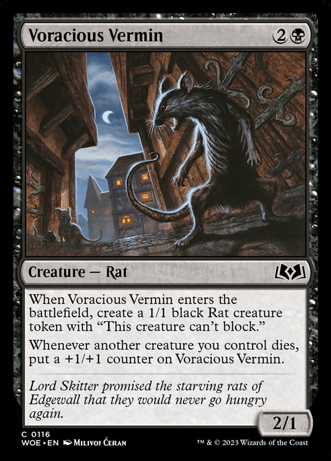 When Voracious Vermin enters the battlefield, create a 1/1 black Rat creature token with "This creature can't block." Whenever another creature you control dies, put a +1/+1 counter on Voracious Vermin.