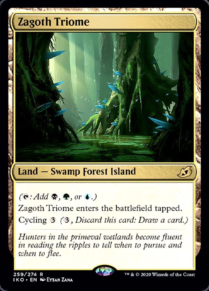 ({T}: Add {B}, {G}, or {U}.) Zagoth Triome enters the battlefield tapped. Cycling {3} ({3}, Discard this card: Draw a card.)